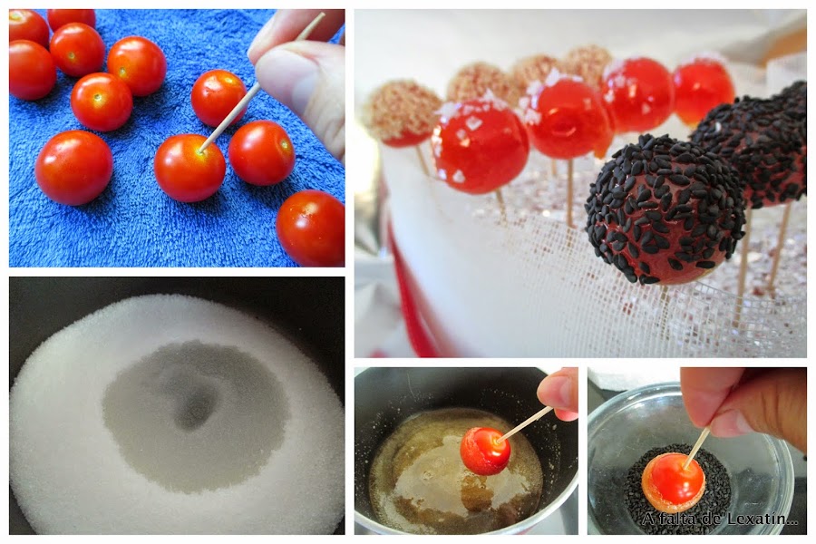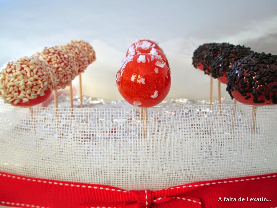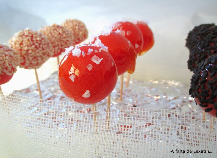 Bañar el tomate en el caramelo, girandolo para que la capa de caramelo sea muy fina y uniforme y no nos cueste morderla ( justo la de la foto es la más gruesa por eso de hacer las fotos mientras intento no quemarme con el caramelo :D )