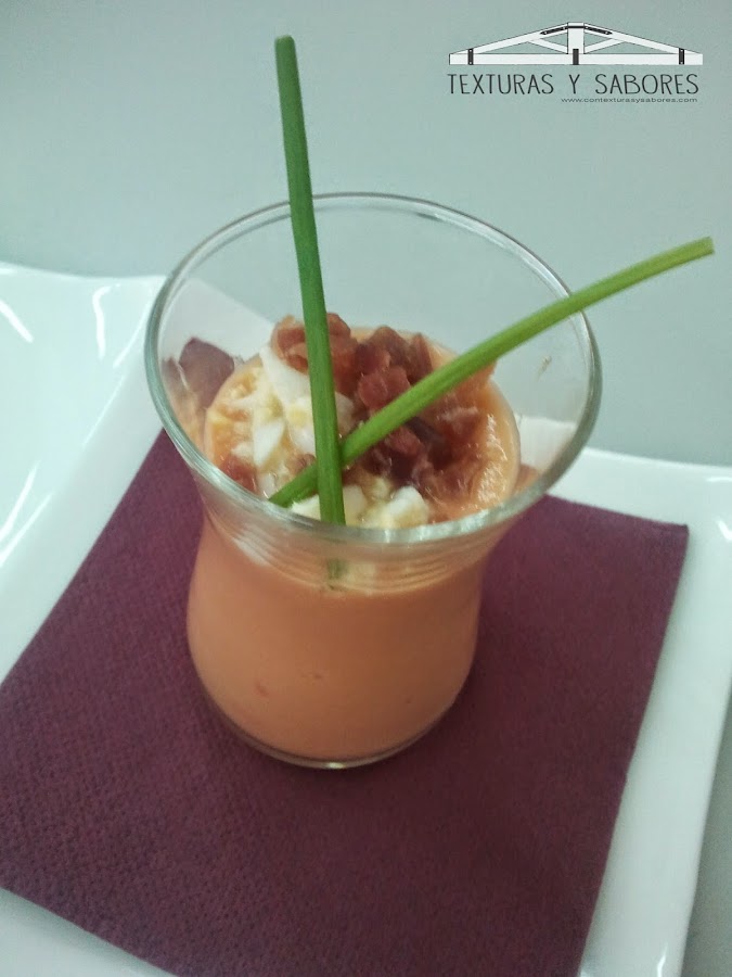 Cortamos los tomates en varios trozos. Hacemos lo mismo con el ajo y se añade a la thermomix junto con el pan. Trituramos todo hasta que esté muy fino. Colar y rellenar en los vasos de chupitos. Reservar en frio.