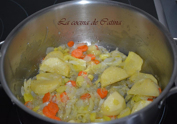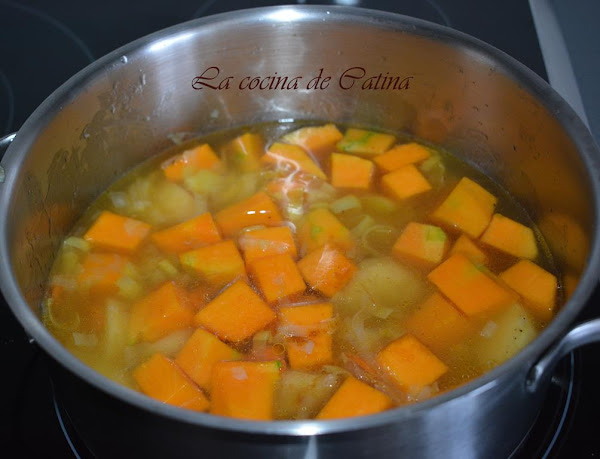 Ponemos una cazuela al fuego con el aceite de oliva, sofreímos el puerro y la cebolla durante un par de minutos, añadimos la manzana, la zanahoria y la calabaza, rehogamos unos minutos más. Añadimos el curry y mezclamos durante unos segundos.