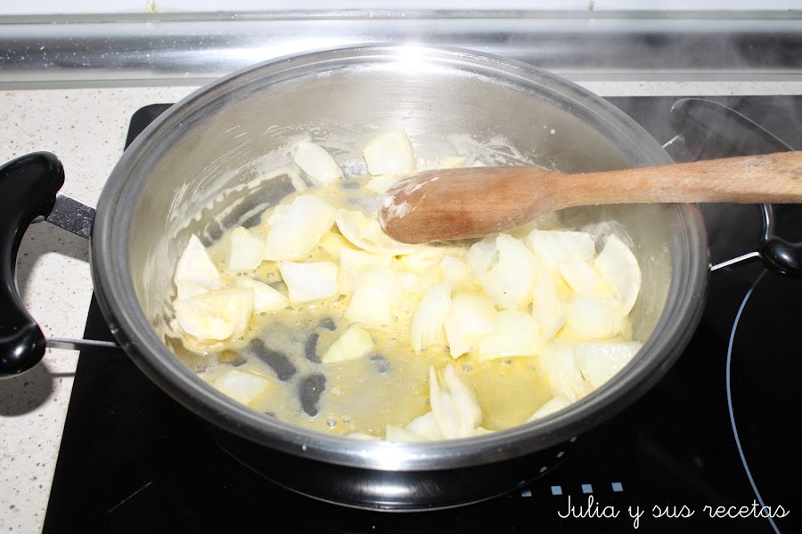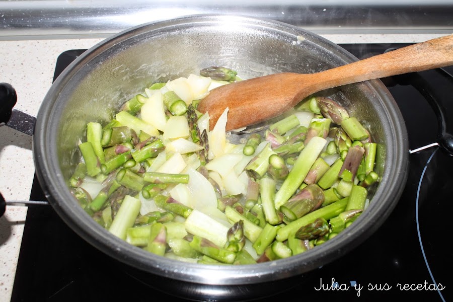 La rehogamos unos minutos y añadimos los espárragos. Los rehogamos unos minutos y añadimos la patata pelada y troceada