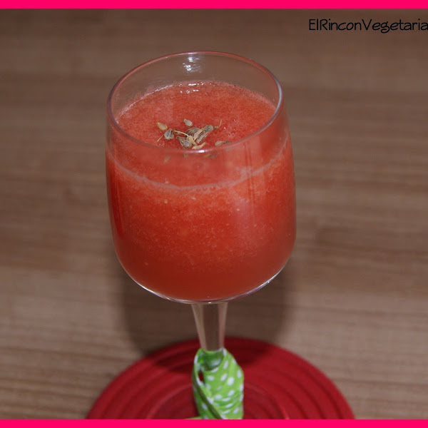 Pelamos la sandía, le quitamos las pepitas y la troceamos. La introducimos en el vaso de la licuadora junto a la naranja, una pizca de canela, un poco de agua y las semillas o el chorro de anís. Licuamos bien, lo dejamos enfriar un poco en la nevera y a la hora de tomar servir en vasos de chupito.