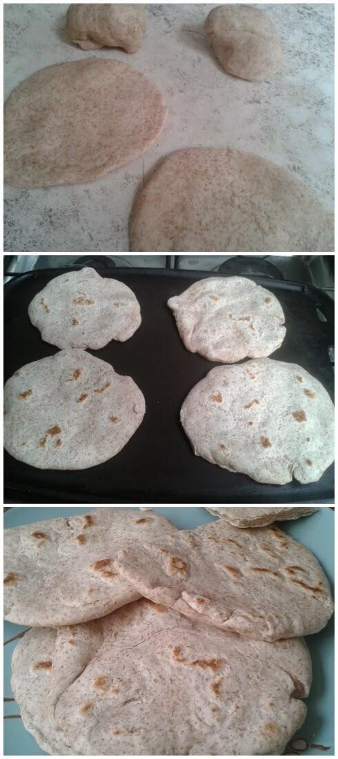 Realmente son facilísimas de hacer, basta con mezclar los ingredientes y amasar por 10 a 15 minutos para desarrollar el gluten, yo no las dejé reposar, sólo corté las 8 porciones, las estiré con la palma de la mano, dándoles forma redondeada y las puse en la plancha bien caliente, las tosté por ambos lados y bajé el fuego para que terminaran de cocinarse, la verdad es que va a depender del grosor, la idea es que sean finas aunque no tanto, se demoran muy poco en hacer.