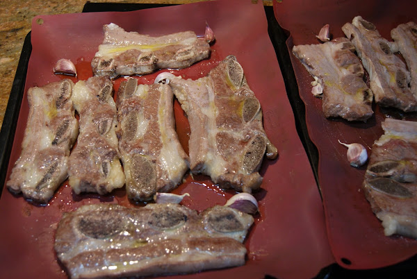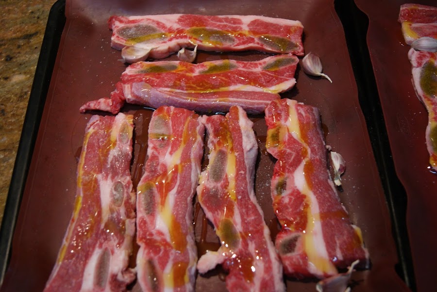 En una bandeja (yo por cantidad he tenido que usar dos) colocamos extendido el churrasco.