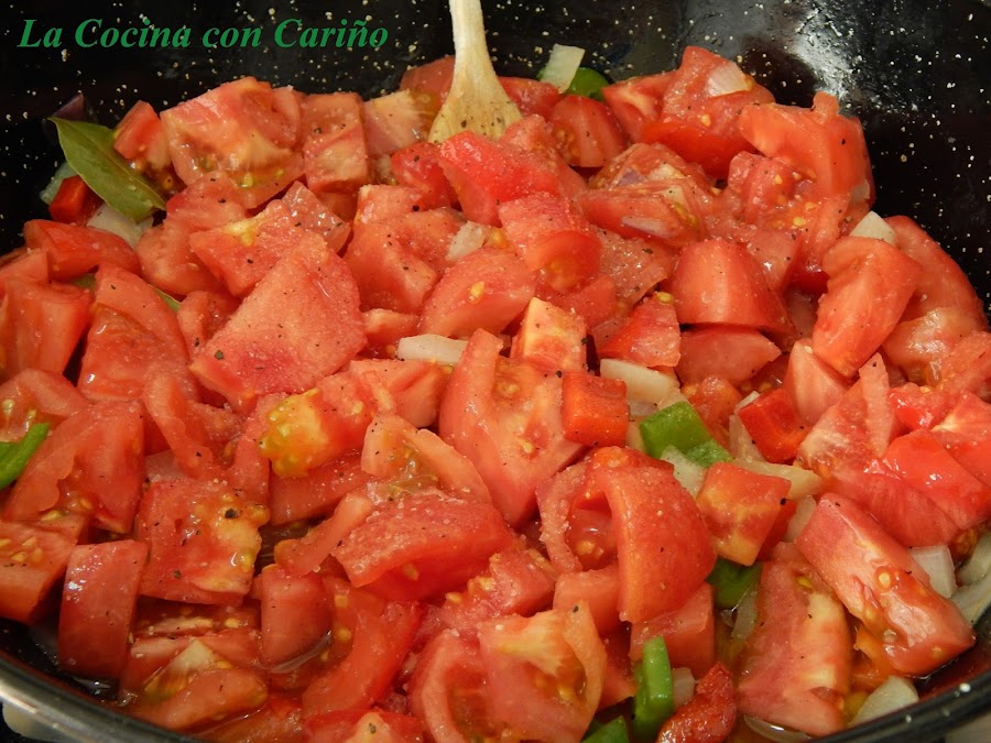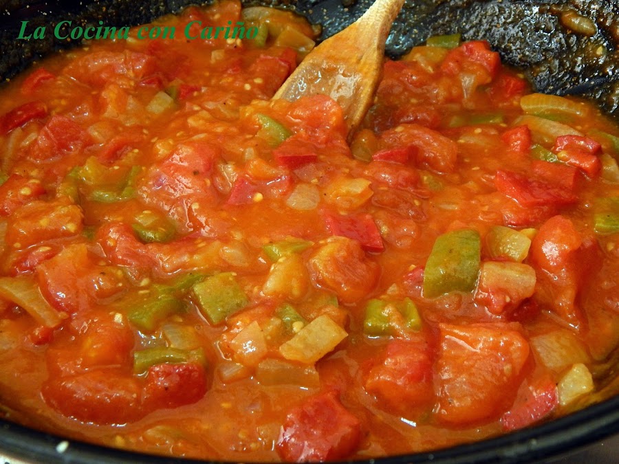 Hoy estoy espesito, a ver que sale de todo esto. Empezamos preparando la salsa de tomate. No es tomate frito, queremos encontrarnos los trozos de todo, incluso los de tomate y no ha de ser seca, sino todo lo contrario. Aceite de oliva virgen extra en un perolillo a fuego medio y cuando esté caliente ponemos la cebolla con un poco de sal, para que sude. 2 ó 3 minutos después, como diría un Peruano, tiramos los pimientos. Con su mijita de sal. Seguimos salteando. Buscamos verduras enteras, así que a los 2 minutos, añadimos los tomates. Salpimentamos, una o dos cucharaditas de azúcar, las hierbas y fuego lento.