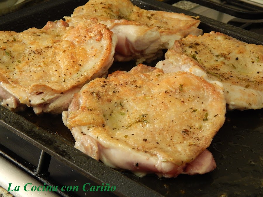 En una plancha, con fuego vivo, calentita y con un hilillo de aceite de oliva virgen extra, colocamos los churrascos por la parte de la piel, con sal y pimienta molida. Buscamos un punto crujiente y dorado de la piel, así que al menos 7 u 8 minutos. Volteamos y dejamos como 3 ó 4. Todo esto es relativo, depende del tamaño de la pieza, etc. Retiramos.