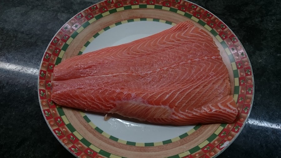 1.- Limpiamos el salmón de espinas y piel.