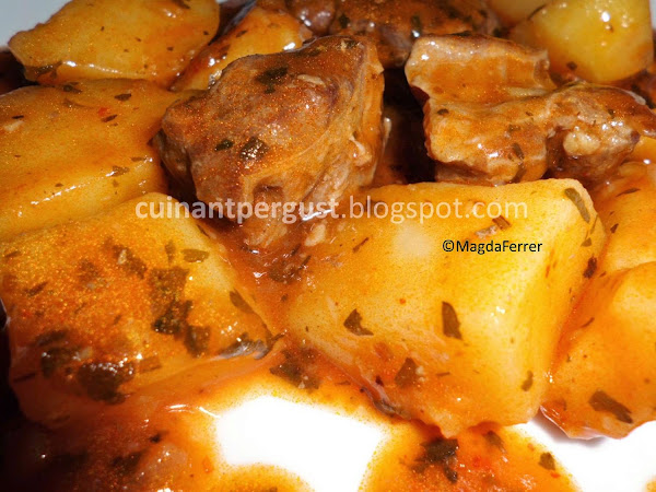 Quitar el hueso del churrasco. Cortar la carne en trozos medianos, salar y reservar. Pelar, lavar las patatas, trocearlas en trozos medianos y reservar. Poner un chorrito de aceite en la cubeta, añadir la carne y freír ligeramente para sellarla, en menú cocina con la tapa abierta. Reservar. En el mismo aceite, seguir en menú cocina con tapa abierta, añadir la cebolla y el ajo y sofreír. Cuando tomen color añadir las patatas, salar al gusto, remover, añadir el tomate y dar unas vueltas. Agregar el vino, la salsa chimichurri, el agua y remover de nuevo. Colocar la tapa y programar menú cocina, válvula cerrada, alta presión 8 minutos. Despresurizar. Servir.