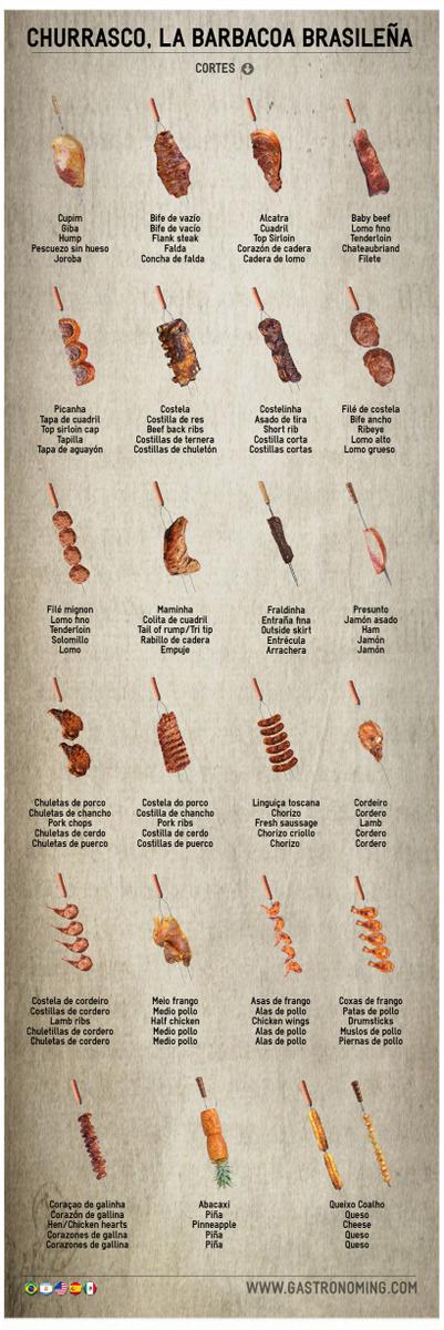 Cupim Es la giba o joroba del ganado cebuino, un corte muy apreciado debido a su intenso sabor, esto, gracias a la gran cantidad de grasa que lleva infiltrada entre su tejido muscular, una carne muy tierna y sabrosa, una de las más populares.Bife de vazío Parte de la falda, extraída de la parte baja de las costillas, en ocasiones se confunde con la fraldinha, es una carne sabrosa, sobre todo los cortes grandes ya que son de animales mayores y con mayor cantidad de grasa.