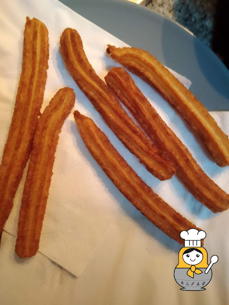 Cuando estén dorados los churros, los retiramos a un plato con papel absorbente para eliminar el exceso de aceite.