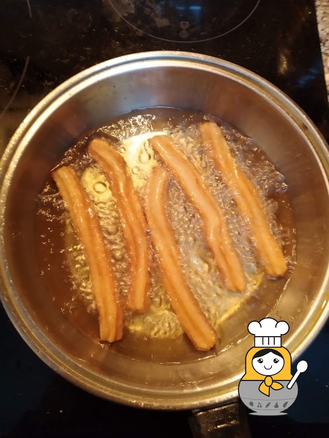 Calentamos una sartén con abundante aceite (puede ser de girasol o de oliva suave) y freímos los churros hasta que se doren uniformemente. Si habéis utilizado la técnica de la manga, es mejor tapar la sartén por si hubiera alguna salpicadura.