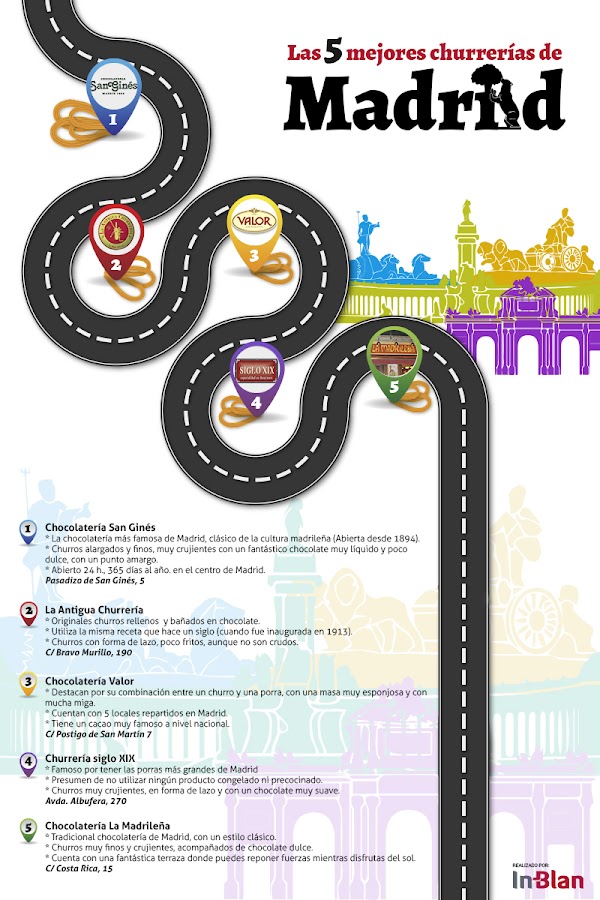 Os dejo por si os interesa esta infografía que he encontrado de la empresa de maquinas de churros Inblan, sobre las mejores churrerías de Madrid... Por supuesto, todas disponen de máquinas de calidad para que el producto sea de lujo (llegan a hacer hasta 10 churros por corte!). La última vez que estuve en Madrid mis amigos me llevaron a un par de churrerías emblemáticas que aparecen en esta lista y doy fé de que son los mejores. Mmmmmmm...
