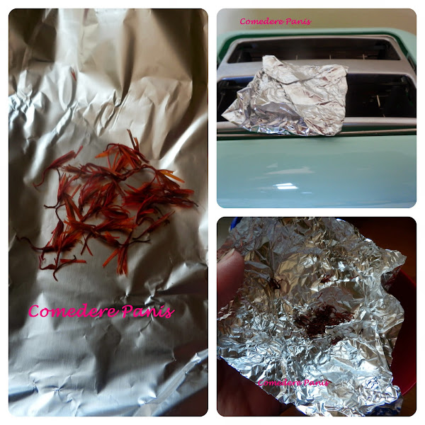 Colocar las hebras de azafrán en un trozo de papel de aluminio y tostarlo ligeramente.