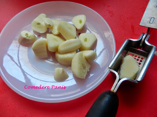 Machacar los dientes de ajo con un almirez o utilizando un prensador de ajos.