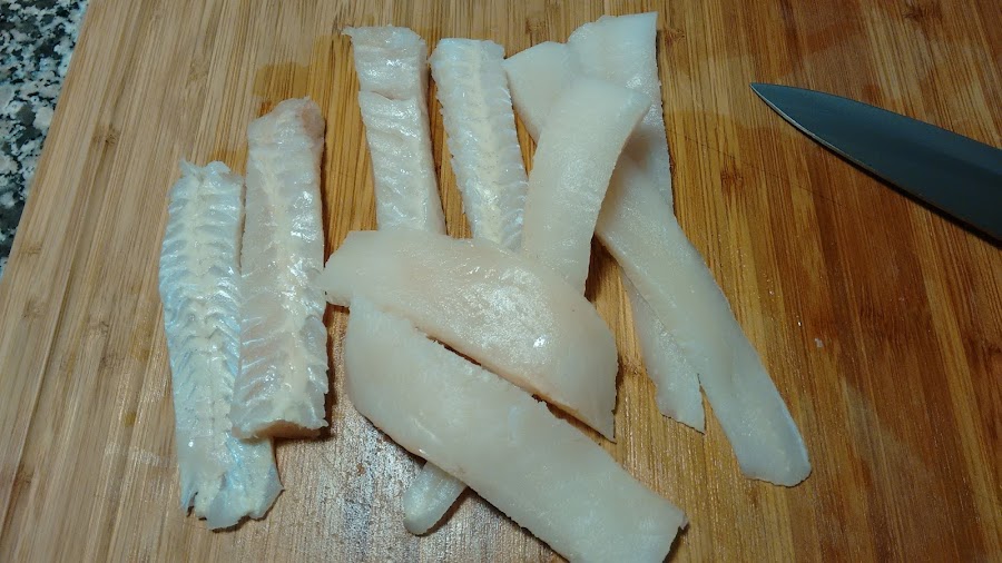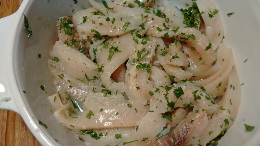 Maceramos la merluza durante unas tres horas, movemos de vez en cuando para que tome el adobo por igual.