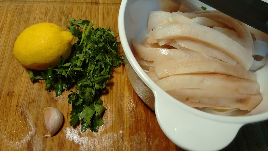 Picar finamente el perejil, el ajo lo trituramos con un picador de ajos ó lo picamos finamente con el cuchillo, exprimimos el limón.