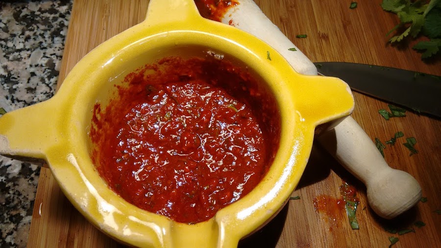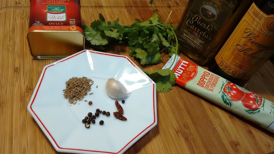 En el mortero majamos los cominos, guindillas, ajo, sal, pimienta y el cilantro, luego incorporamos la pasta de tomate, el pimentón, aceite y vinagre.