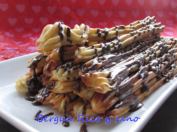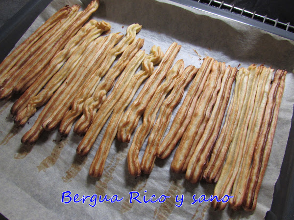 Todo esto para decir que yo en casa como muy sano; espaguetis de calabacín, bizcochos en los que sustituyo mantequilla por puré de manzana, horno en lugar de frito, tortilla de patata asada en lugar de rehogada en aceite, etc. Pero no quita eso que en mi próxima visita a España me de un homenaje con unos buñuelos de calabaza o unos chipirones rebozados, o que a mis invitados les prepare un festín clásico. Y de esa línea de pensamiento surge esta receta de falsos churros, hechos al horno y con muy poquita azúcar (que además se puede sustituir por edulcorante). Se los serví a mis vecinos y hasta mi vecina diabética se atrevió con ellos y le sentaron genial. Evidentemente, no se debe esperar ni la textura ni el sabor de un churro frito y cubierto en azúcar. Pero es una buena receta. A la mesa saqué salsa de chocolate para el que quisiera. Salen unos 24, por cierto.