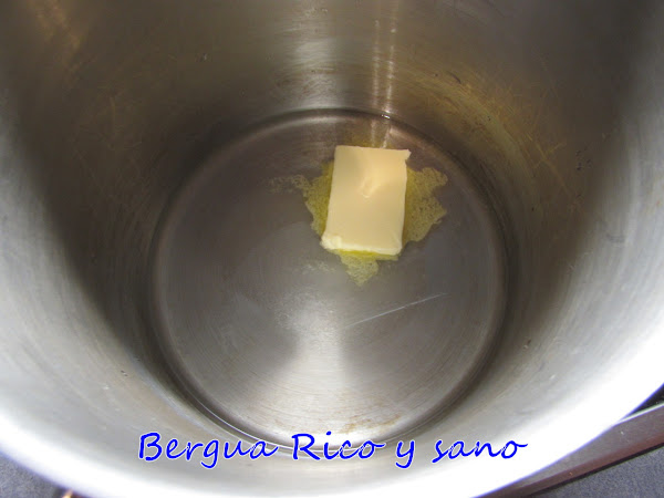 1. En una olla fundimos un poco la mantequilla a fuego medio-lento y añadimos el agua, la sal y el azúcar. Movemos un poco para que se integren los ingredientes.