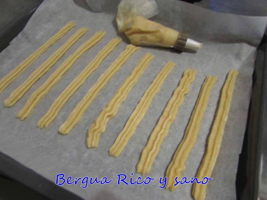 7. Acto seguido formamos los churros sobre papel de horno. Puede ser con boquilla o sin nada decorativo. Yo utilicé la que tenía a mano en ese momento.