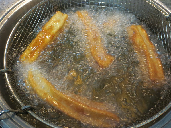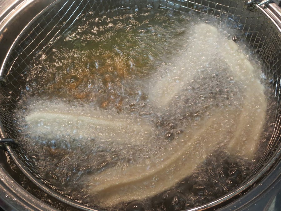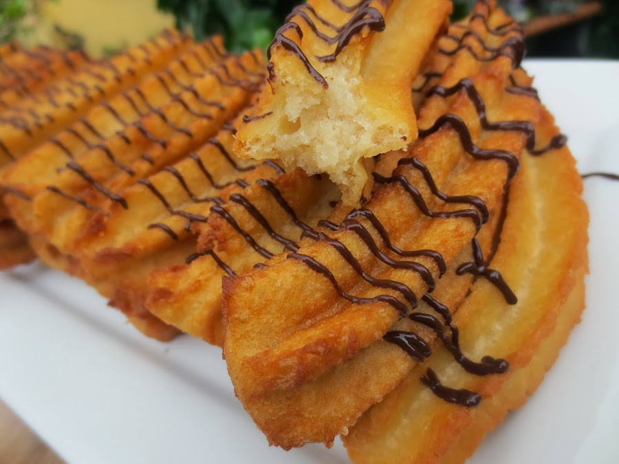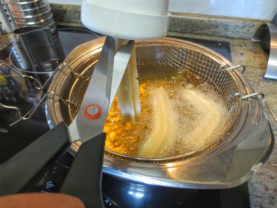 3- Llenar una churrera (No lo hagáis sin churrera eh? Ni en manga pastelera, os pueden EXPLOTAR Y ES PELIGROSO), calentar abundante aceite de girasol e ir cortando los churros sobre el aceite bien caliente hasta que se doren.