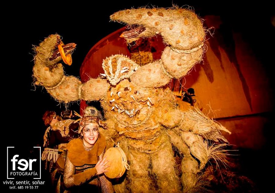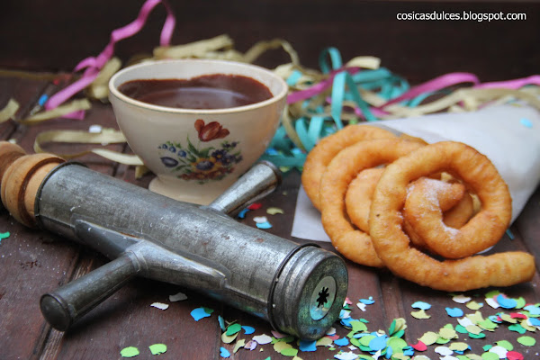 Son muchas las ocasiones en las que os he hablado de los Carnavales, sin duda la fiesta más importante de Águilas que desde el pasado año, para orgullo de carnavaleros y carnavaleros, ostenta la declaración de Interés Turístico Internacional. Si tuviese que buscar unas palabras para definirlas creo que serían, "perfecto equilibrio" y digo esto porque pocos Carnavales existen como el de Águilas en el que se haya logrado aunar deforma magistral tradición y evolución. Los Carnavales de Águilas son hoy ballets y cuerpos de baile, plumas, elegancia y fantasía que llenan de color los magníficos desfiles que saldrán al desfile el próximo domingo, pero son también máscaras y Mussonas y precisamente es a este último personaje al que va dedicado esta receta. La Mussona es, en mi opinión, el elemento más tradicional del Carnaval aguileño. Es un ser que representa la dualidad entre el hombre y la bestia y precisamente por eso cada primer jueves de Carnaval (este año será hoy mismo) protagoniza la Suelta de la Mussona; un acto en el se libera a la bestia desde las mazmorras del Castillo, pasadas las diez de la noche, y desde allí inicia su recorrido amparándose en la oscuridad para atemorizar a todos cuantos encuentra a su paso. Tradicionalmente este personaje, al que sólo consiguen domar con el sonido de las caracolas, vestía con trozos de esparto pegados a su cuerpo, la cara tiznada y una rueda de churros atada a su cola. Hoy el personaje ha evolucionado mucho y manteniéndose fiel al esparto como principal elemento de su disfraz las personas que años tras año le dan vida lucen autenticas maravillas que se completan con unos maquillajes espectaculares(al final de esta entrada os pongo unas fotos). Y como de tradiciones va la cosa, yo para este recetica he rescatado la churrera de casa de mis padres que lleva más de cincuenta carnavales en la familia y que sigue haciendo unos "tallos" (así es como en la jerga aguileña antigua se conocían a los churros)deliciosos. Espero que os gusten.