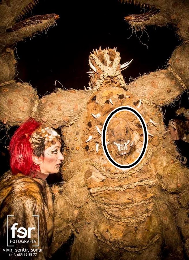 Y os pongo esta última foto para que apreciéis el maquillaje. No se trata de una careta sino de maquillaje. Un trabajo realmente de impacto (lo he marcado sobre la foto porque es difícil apreciar lo que es la cara y lo que es el resto del cuerpo).