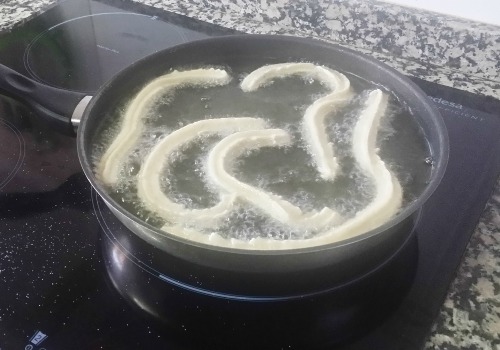Poner a calentar el aceite y vamos friendo los churros por tandas. No es aconsejable poner muchos de cada vez, pues enfría mucho el aceite y tardarían más en dorarse.
