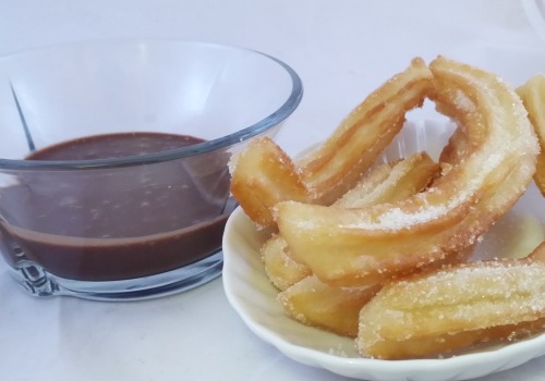 Espolvoreamos con azúcar y servimos bien calentitos. Servir con un vaso de chocolate, un plato de azúcar y un vaso de agua. El vaso de chocolate es para mojar el churro (sin segundas intenciones), el azúcar es para rebozar el churro cuando no lo mojamos en chocolate y el agua es para contrarrestar la inmensa sed que te entra cuando comes todo esto.