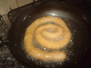 Preparar una sarten honda con aceite para freir. Llenar la churrera con la masa y dejar caer los churros en el aceite bien caliente.