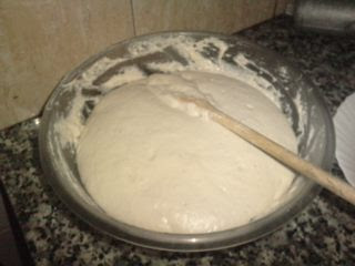 Desleir la levadura con el agua tibia, mezclar la harina y la sal y añadirle el agua con la levadura. Amasar bien, al menos 5 minutos y dejar reposar la masa tapada con un paño hasta que doble de volumen, una media hora, todo depende del calor ambiente que haga.