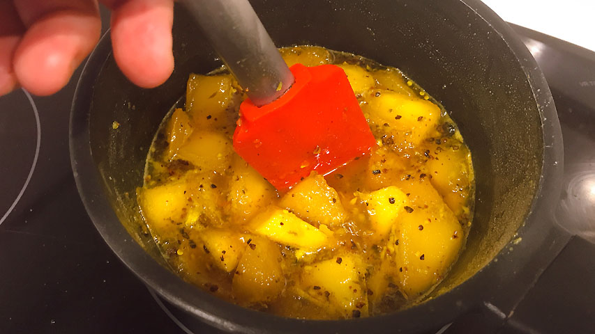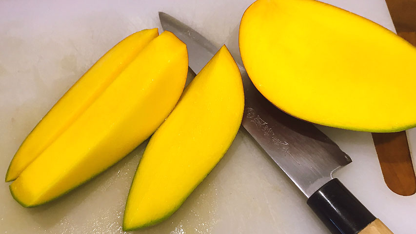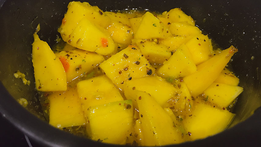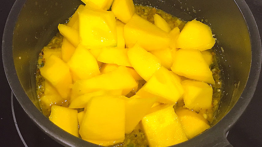 Pela el mango, quitale el hueso y pon la pulpa troceada en la cazuela.