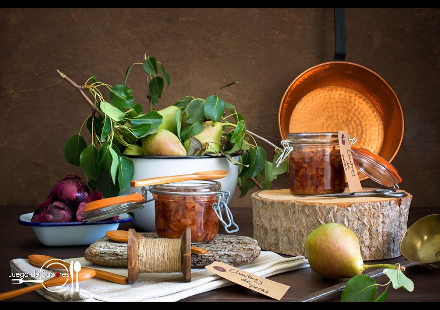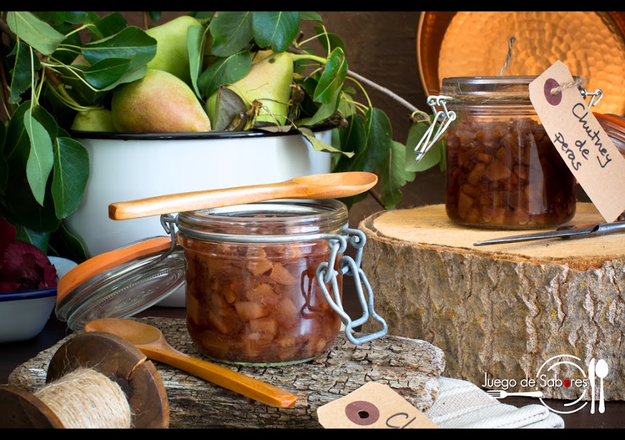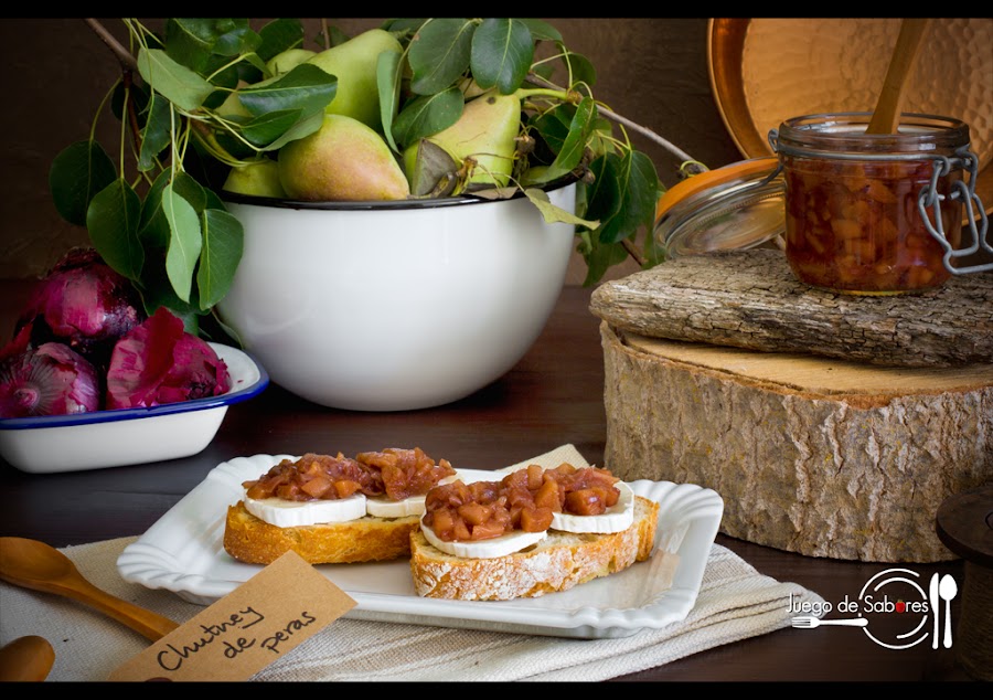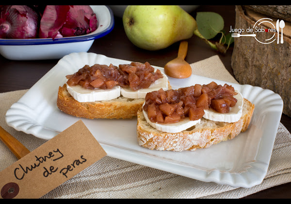 El chutney, ya lo dijimos en su día al referirnos al Chutney de higos y manzanas, es un magnífico acompañamiento de platos que incluyan carnes o pescados. Su elaboración no entraña ninguna dificultad y si lo tratamos como una mermelada puede conservarse en la nevera durante unos meses. De esta manera siempre podremos echar mano de él para dar ese ligero toque agridulce a nuestros platos. Esta vez hemos optado por hacer un chutney de pera y lo hemos presentado a modo de aperitivo sobre una rebanada de pan con una loncha o rulo de queso de cabra. El resultado es sorprendente.