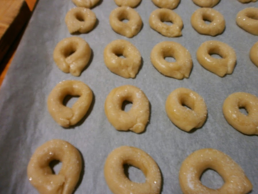 Staccare piccole quantitá di impasto,formare dei cilindretti e unire le estremitá per formare una ciambellina.