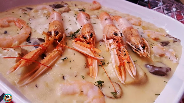 3.- Añadimos la nata (crema de leche), un ponemos el caldo de los langostinos y cocinamos 10 minutos más. Salpimentamos al gusto, agregamos los langostinos y las cigalas. En otra sartén doramos un poco los tacos o virutas de jamón serranos y los esparcimos por encima, añadimos un poco de eneldo fresco picado. Servimos enseguida.