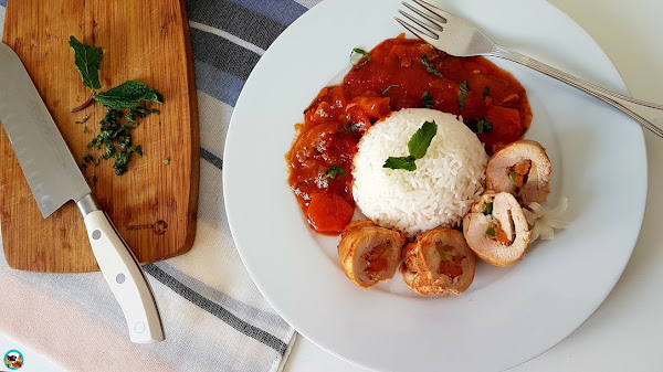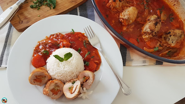 Para hoy tengo un exquisito plato de muslos de pollo sin hueso rellenos de verduras con una rica salsa de setas y un arroz jazmín.