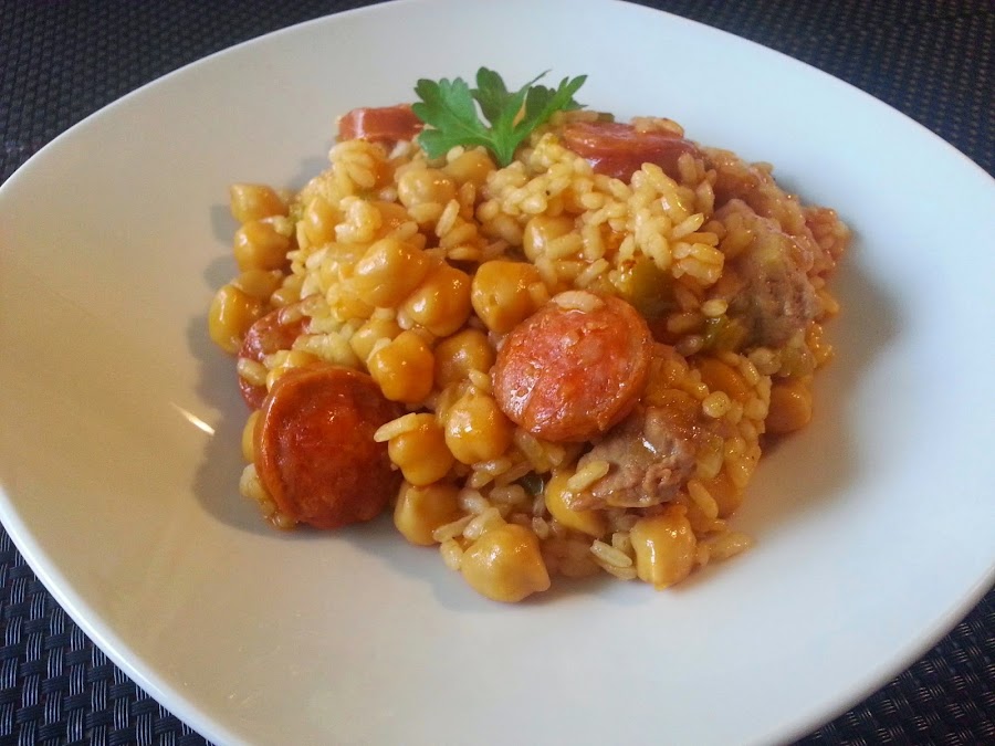 Empezamos con un jugoso arroz con garbanzos y chorizo. Un plato ideal para este tiempo, contundente y calórico.