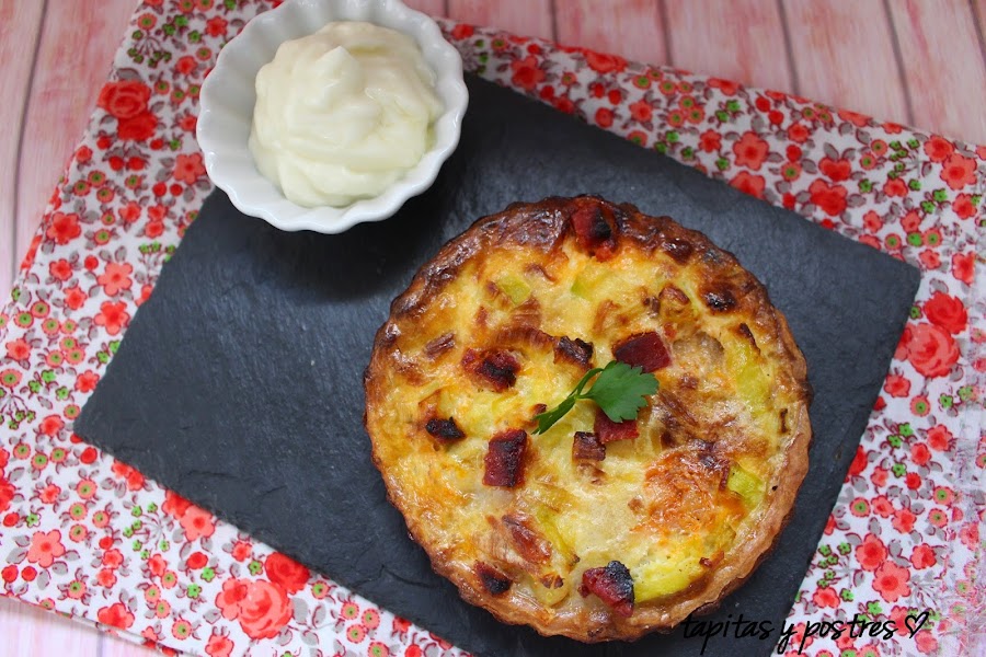 María José nos muestra en su blog Tapitas y Postres su versión de la quiche Lorraine. La elaboración es muy sencilla: en una sartén ha sofreído puerro y calabacín, luego lo ha mezclado con leche evaporada, huevos, queso, sal y pimienta. Este sería el relleno de la masa quebrada. Antes de hornear, lo ha decorado con láminas de calabacín y taquitos de chorizo.