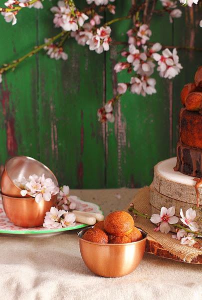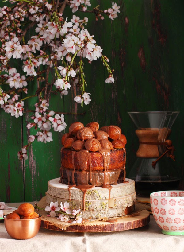 En un plato ponemos uno de los discos del pastel. Echamos una cucharada de relleno y ponemos el otro disco. Colocamos las bolitas sobre el y vertemos todo el glaseado sobre nuestro pastel.