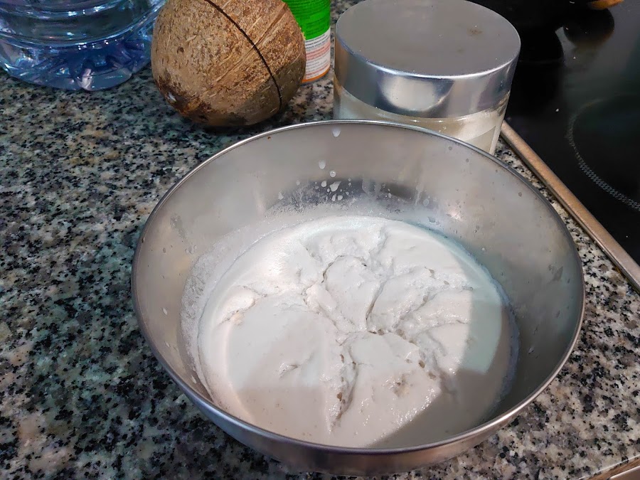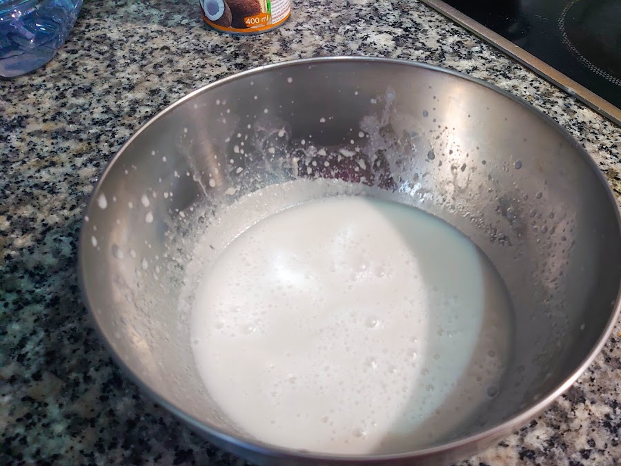Primero vamos a realizar el pre-fermento, para ello mezclamos la leche de coco con una cucharada de azúcar y el agua y la levadura, recuerda que la temperatura de de los líquidos debe estar entre los 25 y 40ºc, tibios para optimizar la función de la levadura:Tapar y dejar reposar por mínimo 10 min: