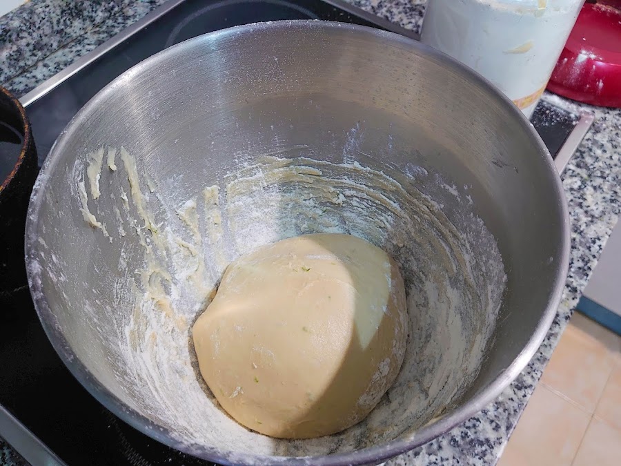 Ahora mezclamos en un bol los ingredientes restante, la harina, huevos, el pre-fermento el agua, aceite de coco, sal todo menos el limón y mezclamos hasta que todos los ingredientes estén bien integrado y se forme una mezcla uniforme y al final agregar el limón: