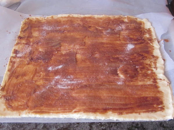 Derretimos la mantequilla del relleno y pintamos la masa con ella, espolvoreamos de azúcar ,sed generosos, y de canela, igual.