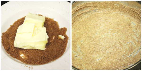 Mientras tanto mezclamos los 90 gr de mantequilla restantes con los 65 gr de azúcar moreno y con esta mezcla untaremos las paredes y la base del molde redondo que vayamos a usar.