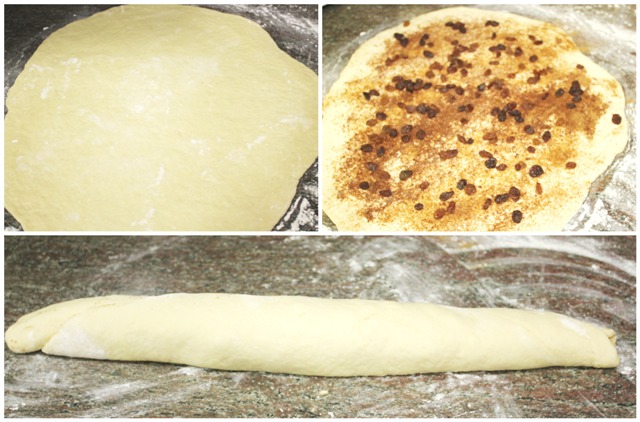 Sobre la masa estirada untaremos los 45 gr de mantequilla a temperatura ambiente, le espolvorearemos los 35 gr de azúcar moreno y la canela en polvo. Le añadimos las pasas bien repartidas. Lo enrollaremos sobre si mismo hasta formar un rulo y lo dejamos reposar en nevera unos 5 minutos.