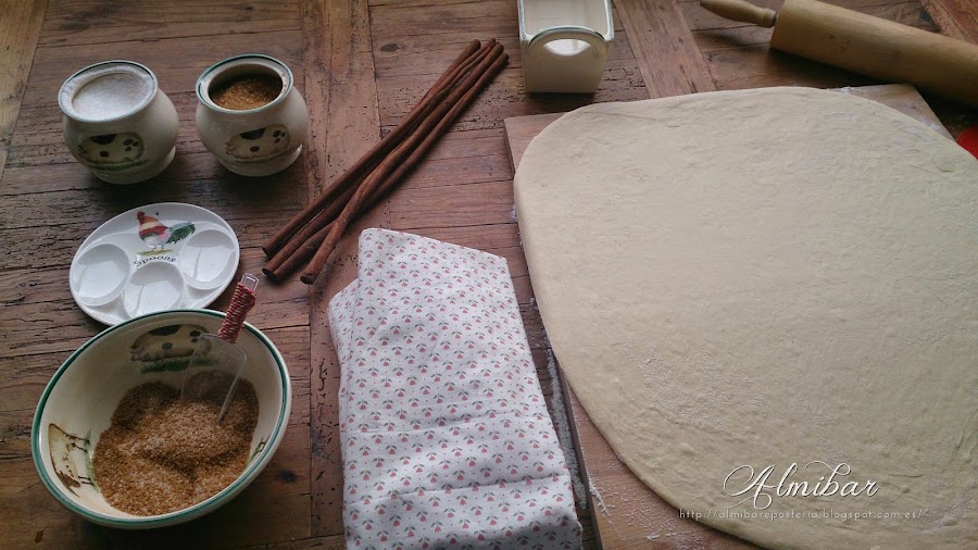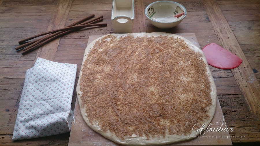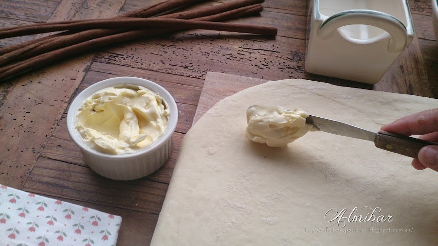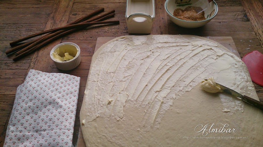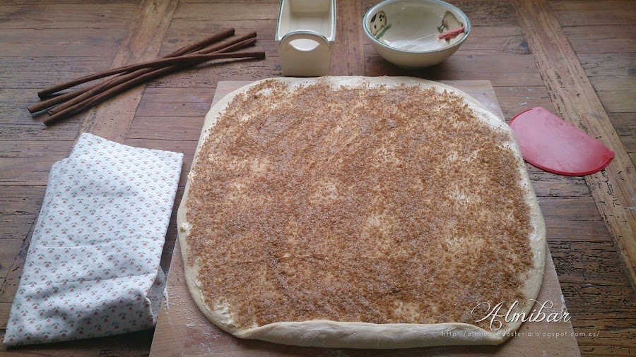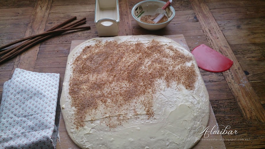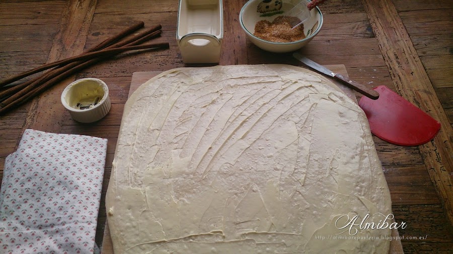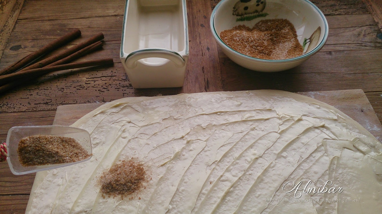 ...rellena con la mezcla de azúcar y canela la masa estirada con mantequilla...