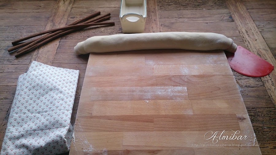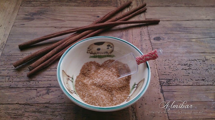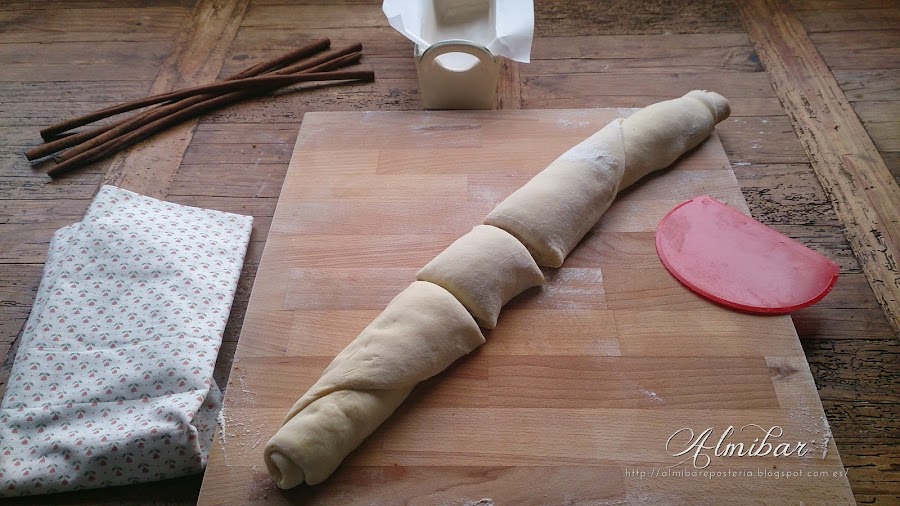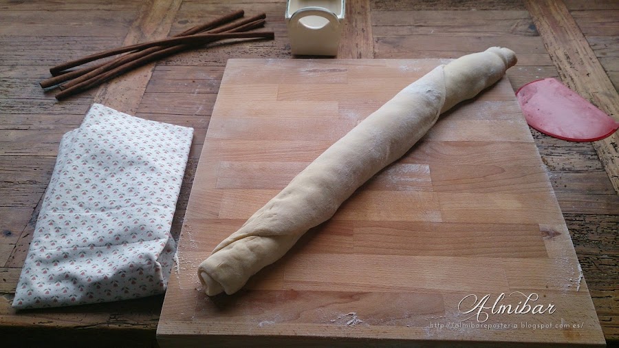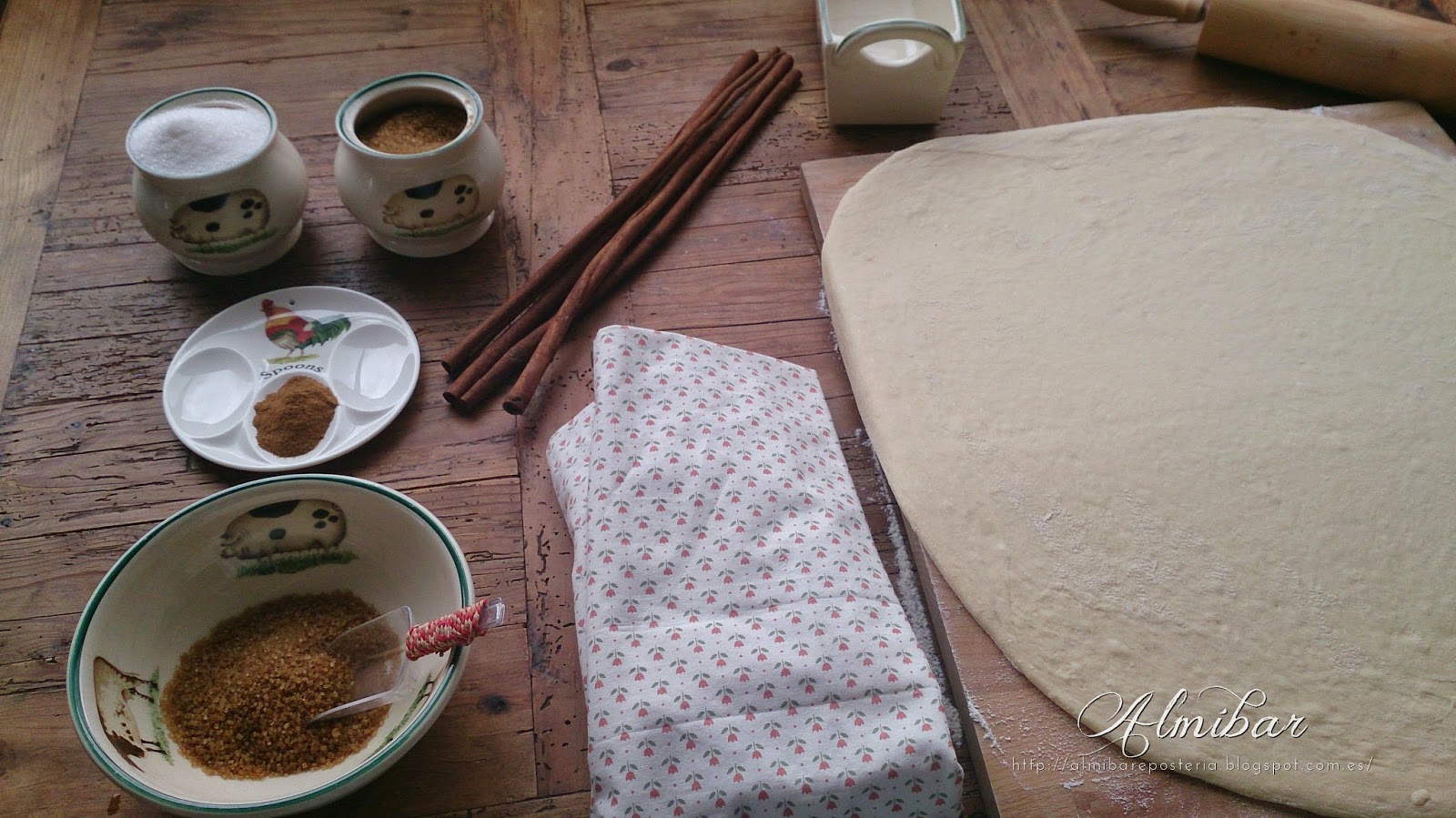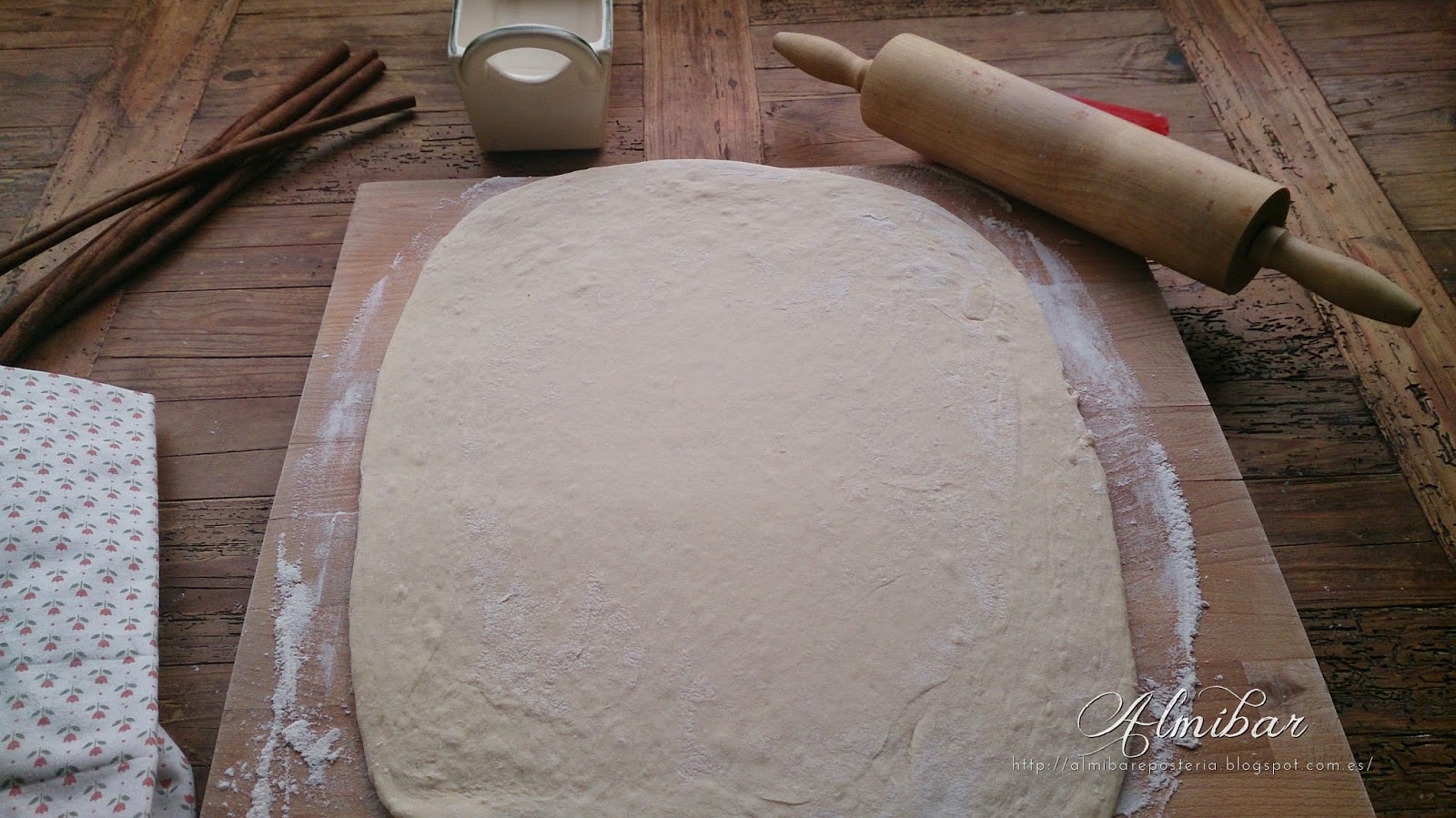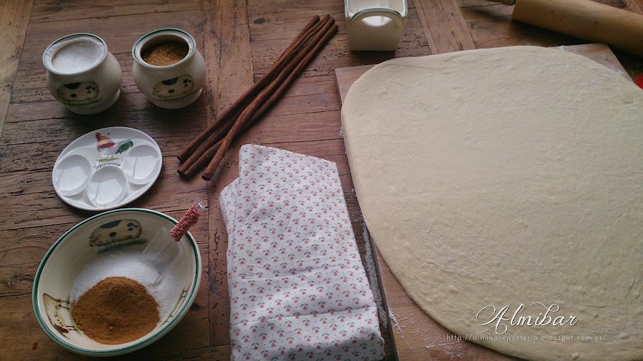 ...rellena con la mezcla de azúcar y canela la masa estirada con mantequilla...
