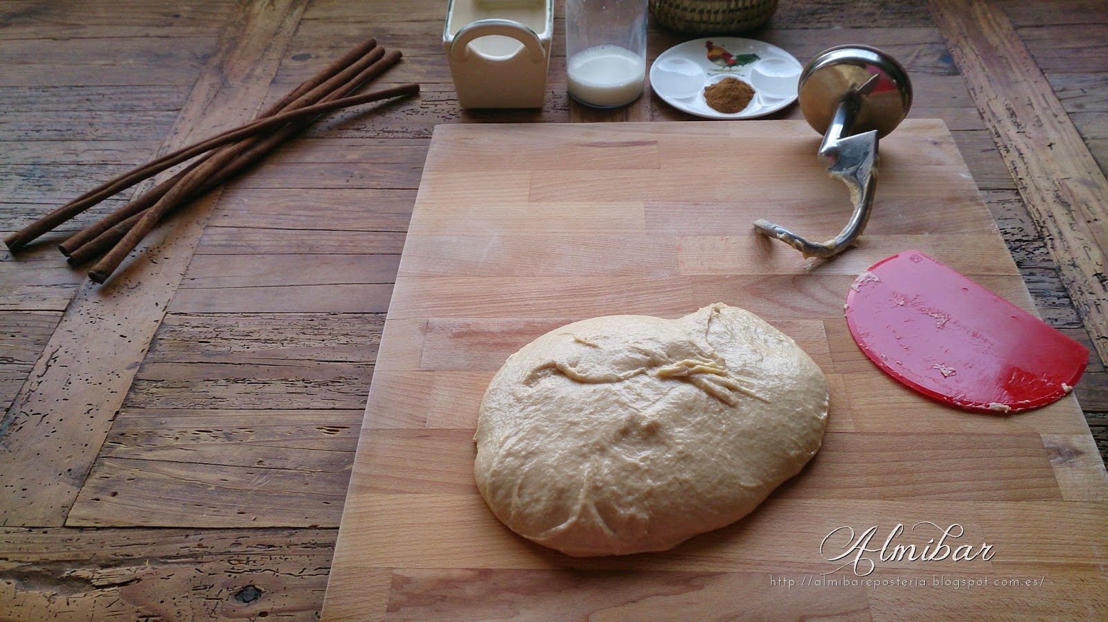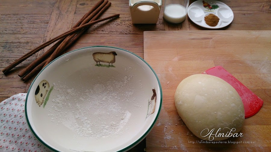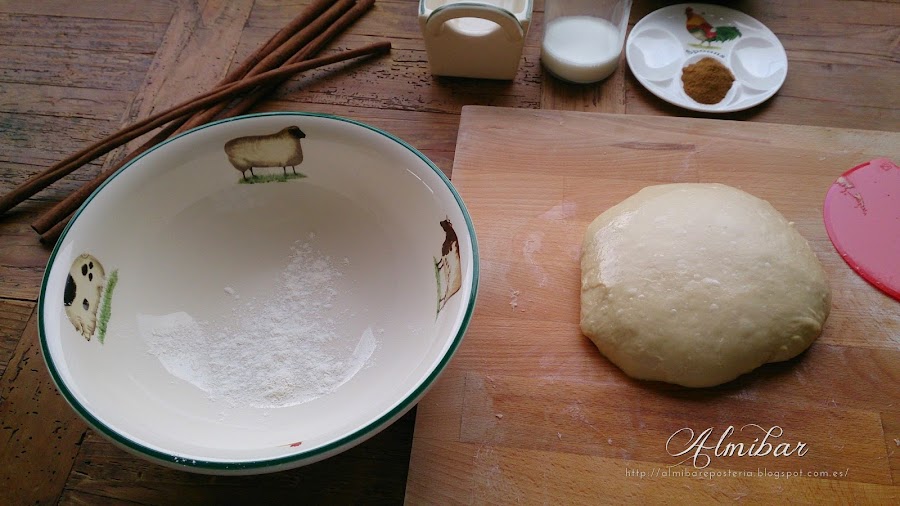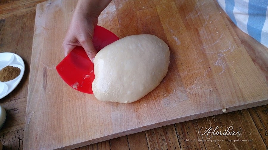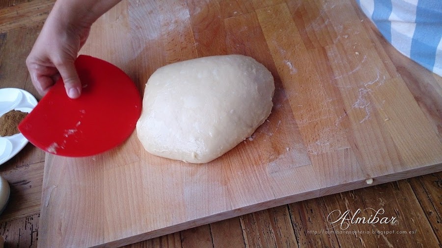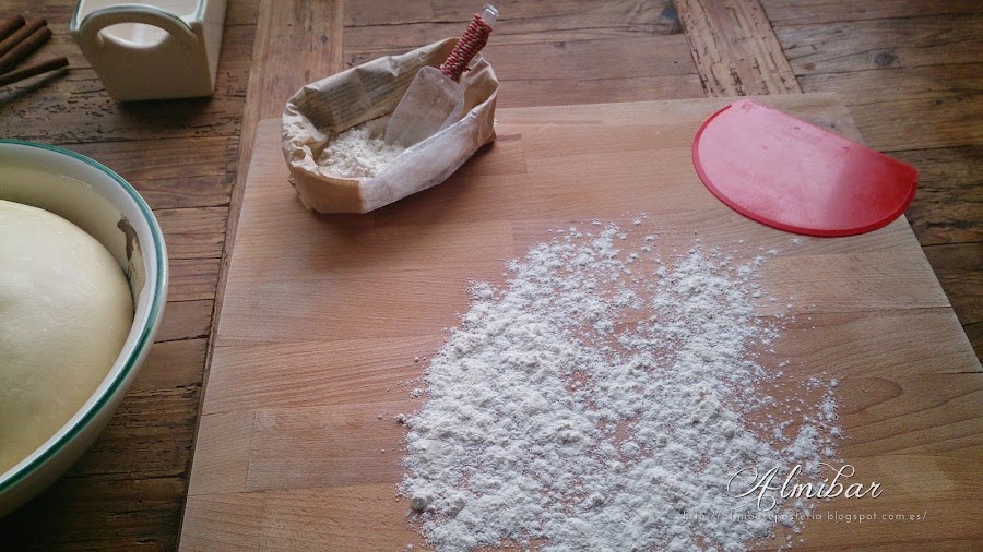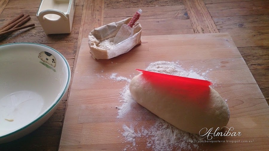 ...pasas la masa desgasificada a la mesa de trabajo apoyando la cara brillante y sedosa en la harina...