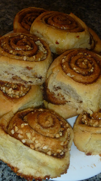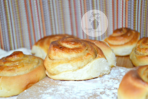 Es un pan dulce en forma de rollos, muy suave, con increíble aroma gracias al la capa de mantequilla, la canela y el rico sabor a toffee que le aporta el azúcar moreno, son ideales con el café, y se suelen glasear con un poco de azúcar, yo lo he variado y le he puesto un topping de queso crema, y solo puedo decirte "rico, rico, rico"..