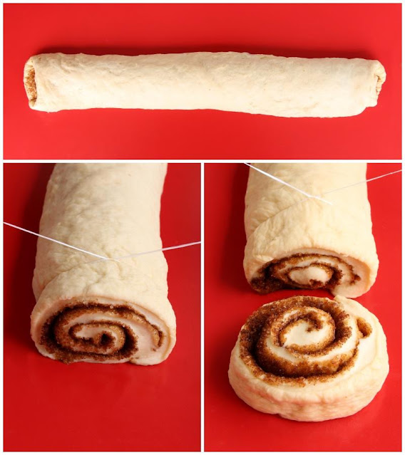 Se pasa el hilo dental por debajo, se hace un nudo, se estira el hilo y se corta la masa quedando unos rollitos perfectos