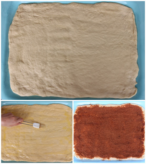 Pincelar la mantequilla derretida, y espolvorear por encima la canela molida y el azúcar moreno.
