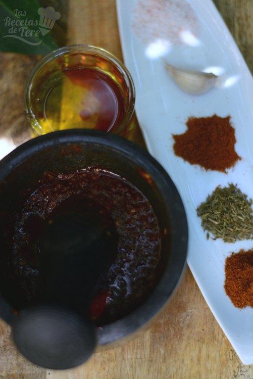 En un mortero pones los dientes de ajos cortados pequeños, los dos tipos de pimentón, la cayena, el comino con unos 50 mililitros del aceite de oliva, mezclas y unes todo bien, agrega por último la sal, y sigue uniendo todo, que queda una mezcla espesa roja.